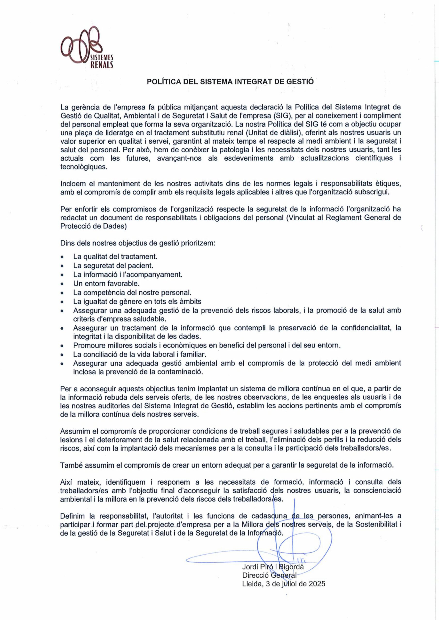 Copyright © 2025 | Política de Privacitat | Política de cookies | Avís legal | Política de Seguretat | Política SIG Sistemes Renals +34 973 24 77 76 · Enric Granados, 13 1a planta · 25008 LLEIDA · www.sistemes-renals.com